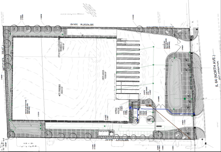 Weaver Consultants Group (WCG) provided civil engineering and landscape design services for the proposed 80,000 SF freezer/cooler facility on a 4.4-acre parcel in Lombard, Illinois. The parcel, which is located on the north side of North Avenue, was heavily vegetated with an abandoned building on the southern portion of the site. Weaver worked with the end-user and the general contractor to develop a Site Plan that would satisfy the needs of the company while also satisfying the requirements of the Village of Lombard, DuPage County, Illinois Department of Transportation (IDOT), and the Illinois Environmental Protection Agency (IEPA). Stormwater detention and Best Management Practices were required following the DuPage County Stormwater Development Ordinance and were provided in above-ground BMP infiltration basins along with four- and eight-foot diameter underground detention pipes. The site is adjacent to an existing hotel, and noise pollution and visual screening were a concern. WCG was able to incorporate these into the landscape design in order to create an aesthetic appeal from the neighboring uses.