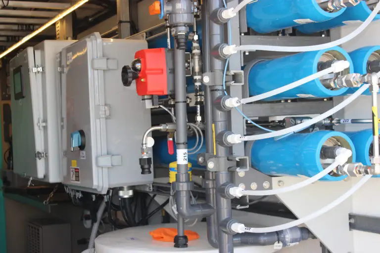 After arriving on-site, the trailer is staged near the underground storage tanks and on-site water treatment system. Initial water quality and chemistry measurements are evaluated, and select chemicals are dosed to aid in the pretreatment of the water. Bag filtration and flocculation using coagulants are primarily used in the initial prefiltration process to remove suspended solids, oil, grease, and fuels.